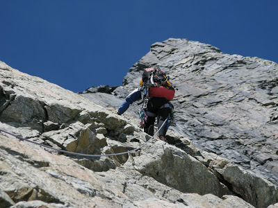 Rope length followed by timeless rope length, Jamie and I measure off the climb. Sometimes we chat at belays, other times we exchange equipment and move on with only a word or two. Shadows lengthen around us as the sun sinks towards the western horizon. We don’t talk about how distant the summit may or may not be, but it is on both of our minds. A night out on the rock would be an unpleasant experience, to say the least. An old climber once told me not to count on how close the summit is – that way I can’t be disappointed if it doesn’t arrive when I expect. Just keep ticking off the pitches. Keep moving. Keep concentrating.