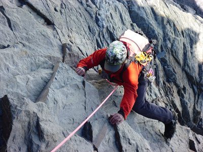 Jamie grins like a Cheshire cat as I step across to his belay ledge. Actually, the ledge is more like two bookends put together, and slopes sharply off at one side. Jamie is anchored to the rock with various forms of metallic climbing paraphernalia linked together by a length of nylon cordelette, and he coils the rope at his feet as I approach.