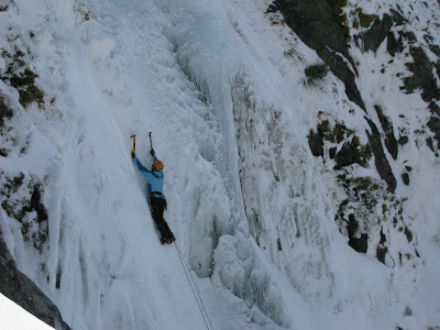 The day after Zim received his award, he, Shell and myself headed down country in search of winter delights. Despite average weather, we found an unclimbed frozen waterfall four pitches high. Excitement levels rose.