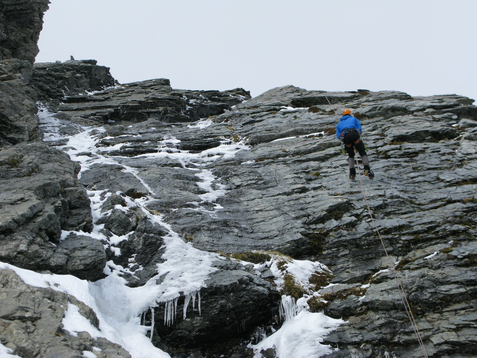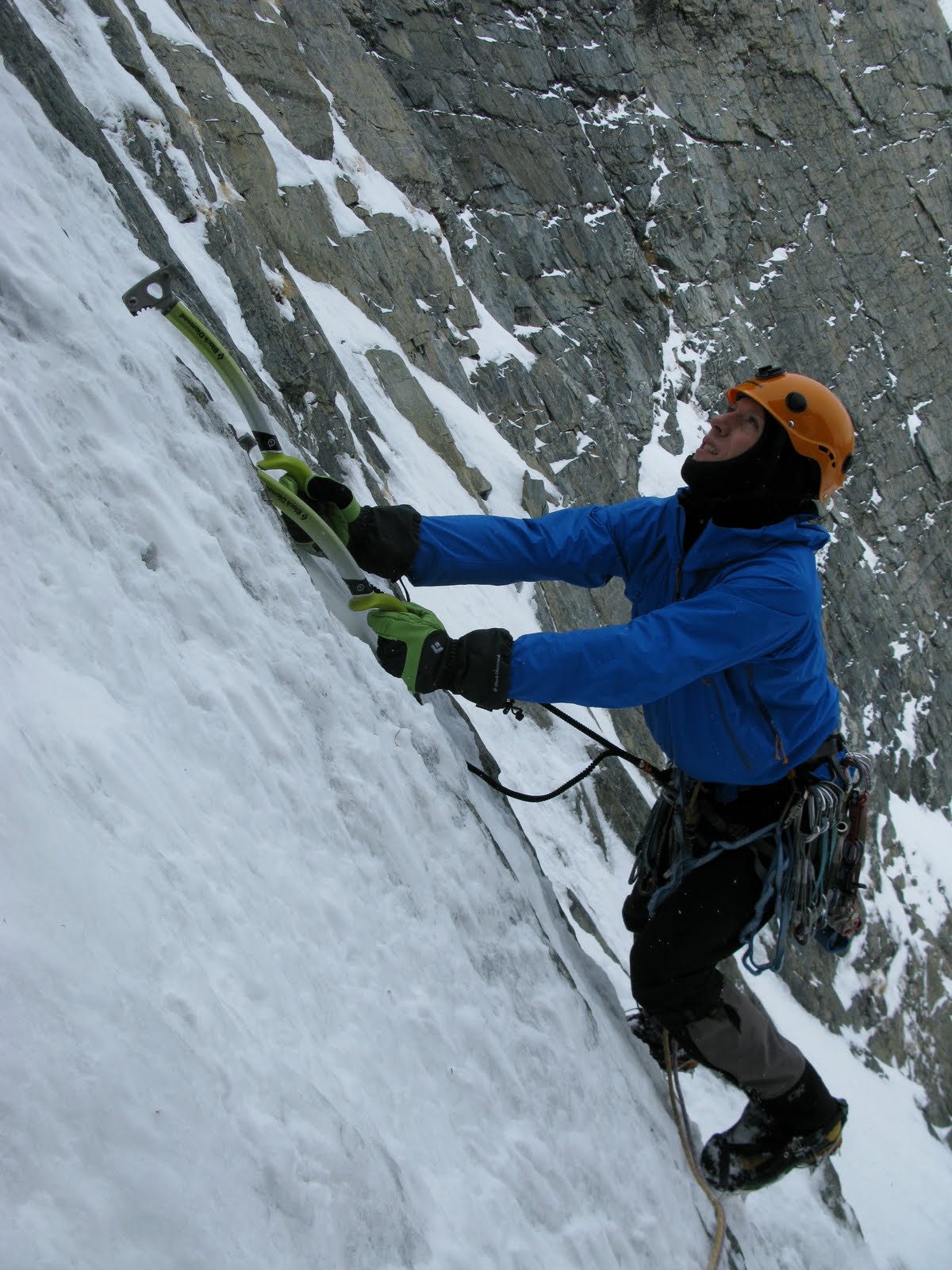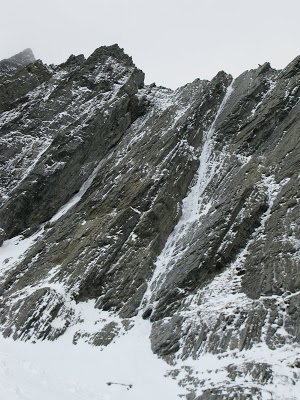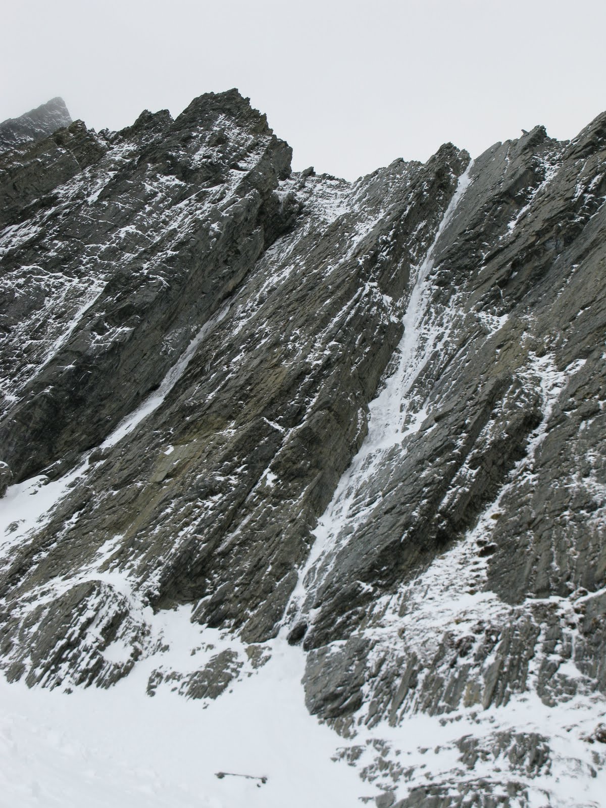 Plan B came into view – a thin white streak running straight up the western flank of Dasler Pinnacles. Never more than two metres wide, and mostly less than a metre, it was as clean a line as I’d seen for some time. Two, maybe three pitches long, it looked amazing. Jamie and I geared up.