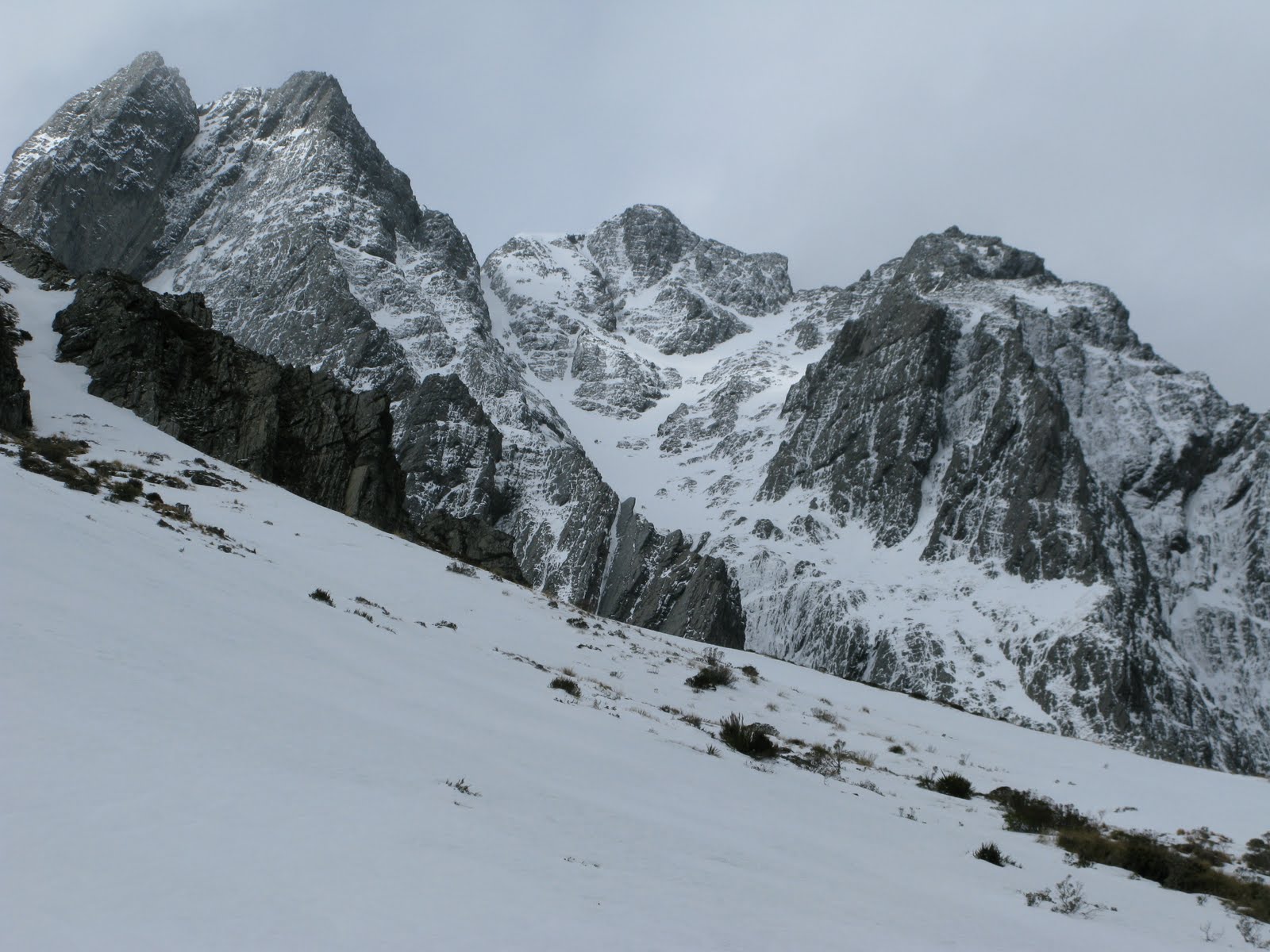 The next morning it seemed the weather couldn’t make up its mind. We decided not to follow suit so, at first light, started clambering through the beech forest, traversing round into the valley between Dasler Pinnacles and Glen Mary. We were going to climb somthing!