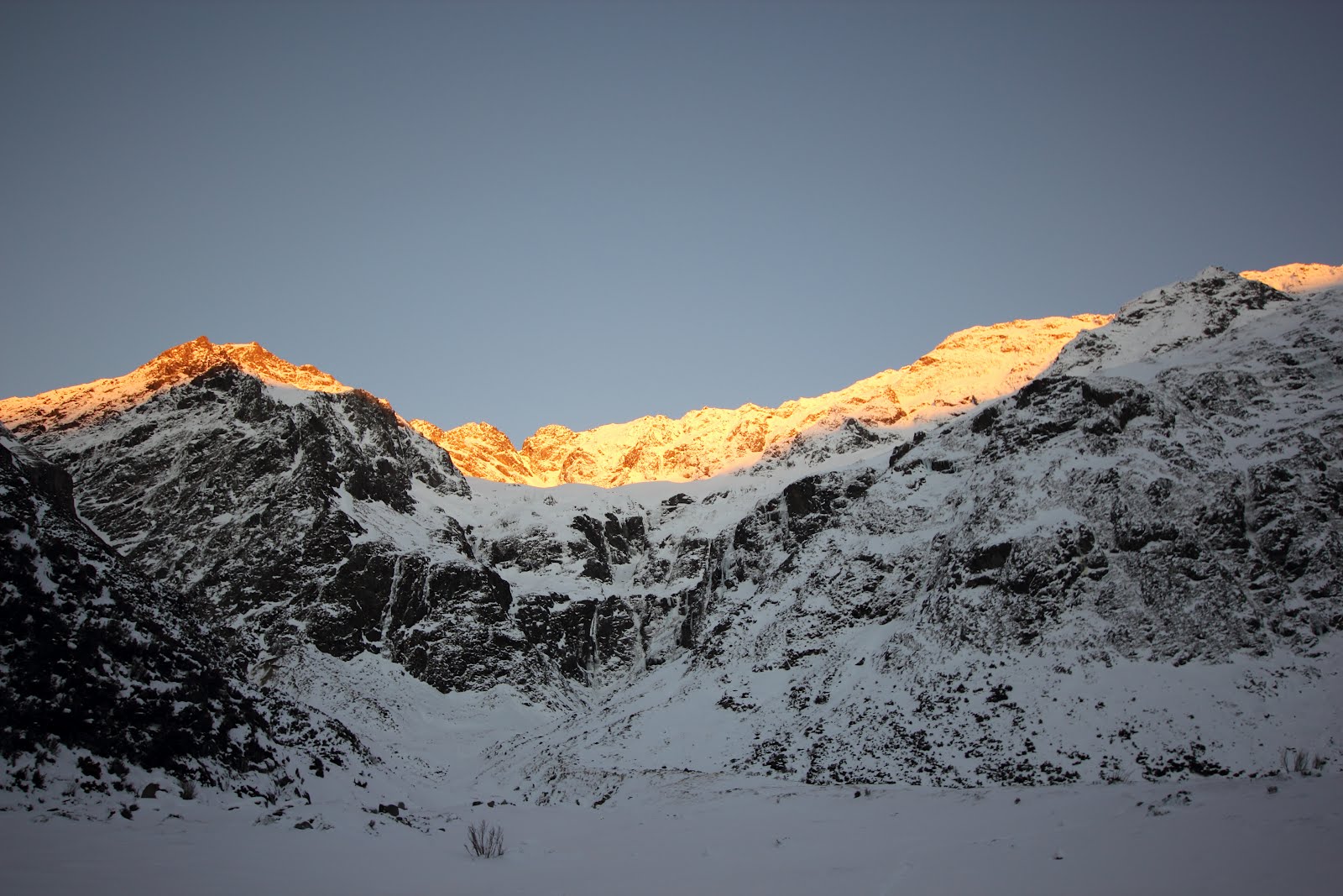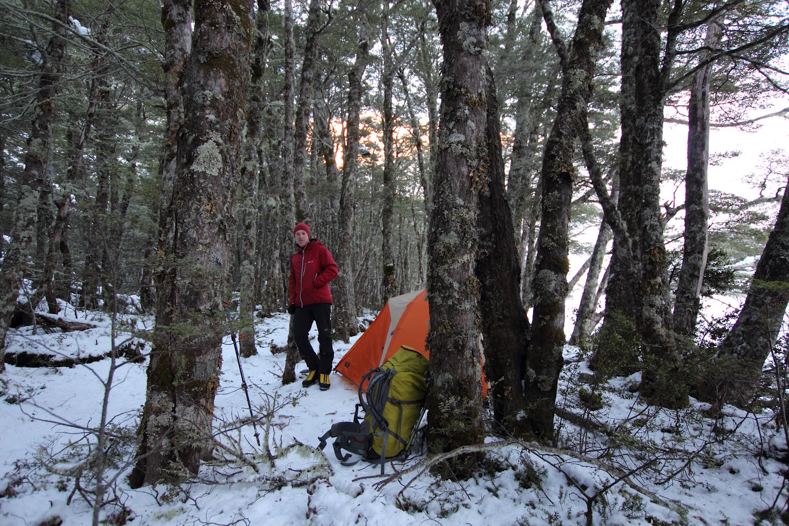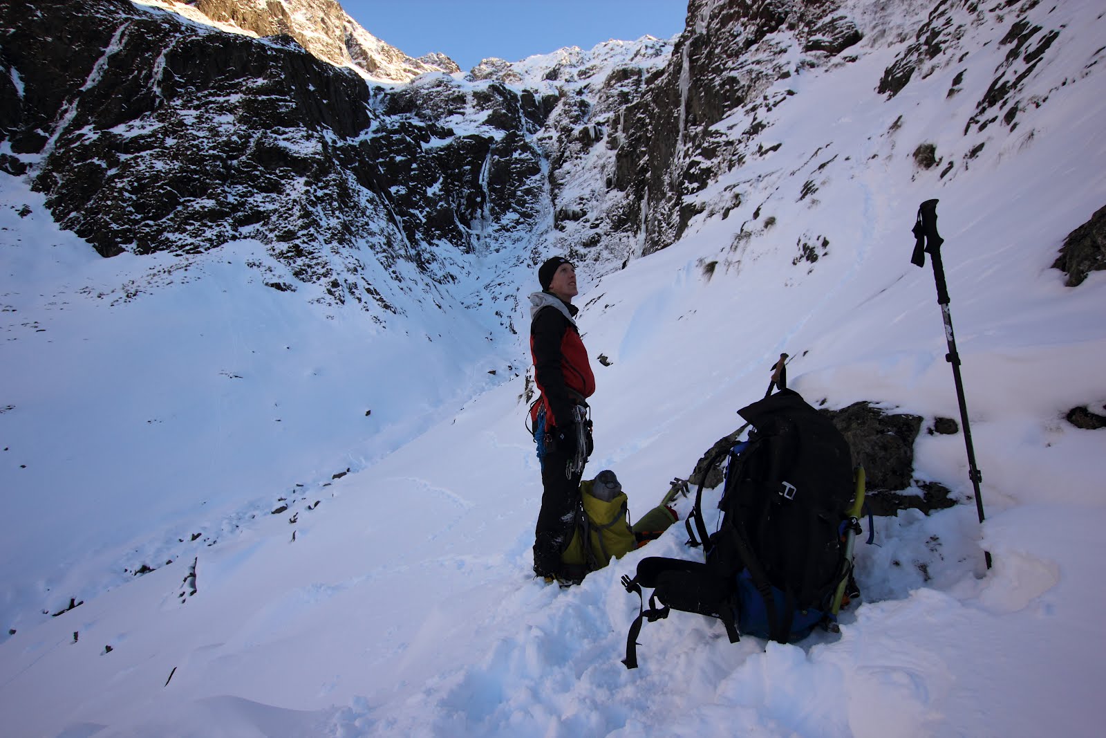 Unconsolidated, windblown snow kept progress slow as we plugged towards the head of the valley. After setting up camp in the beech forest, we carried on up to the headwalls under Rabbiter’s and Belfry Peaks. Long snaking veins of ice drooped down a number of drainage lines, and we started to get excited.