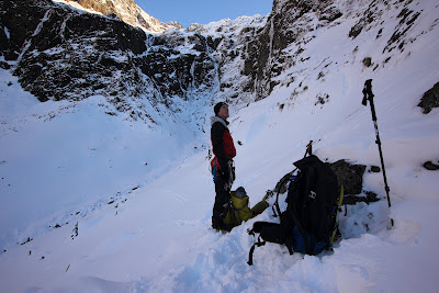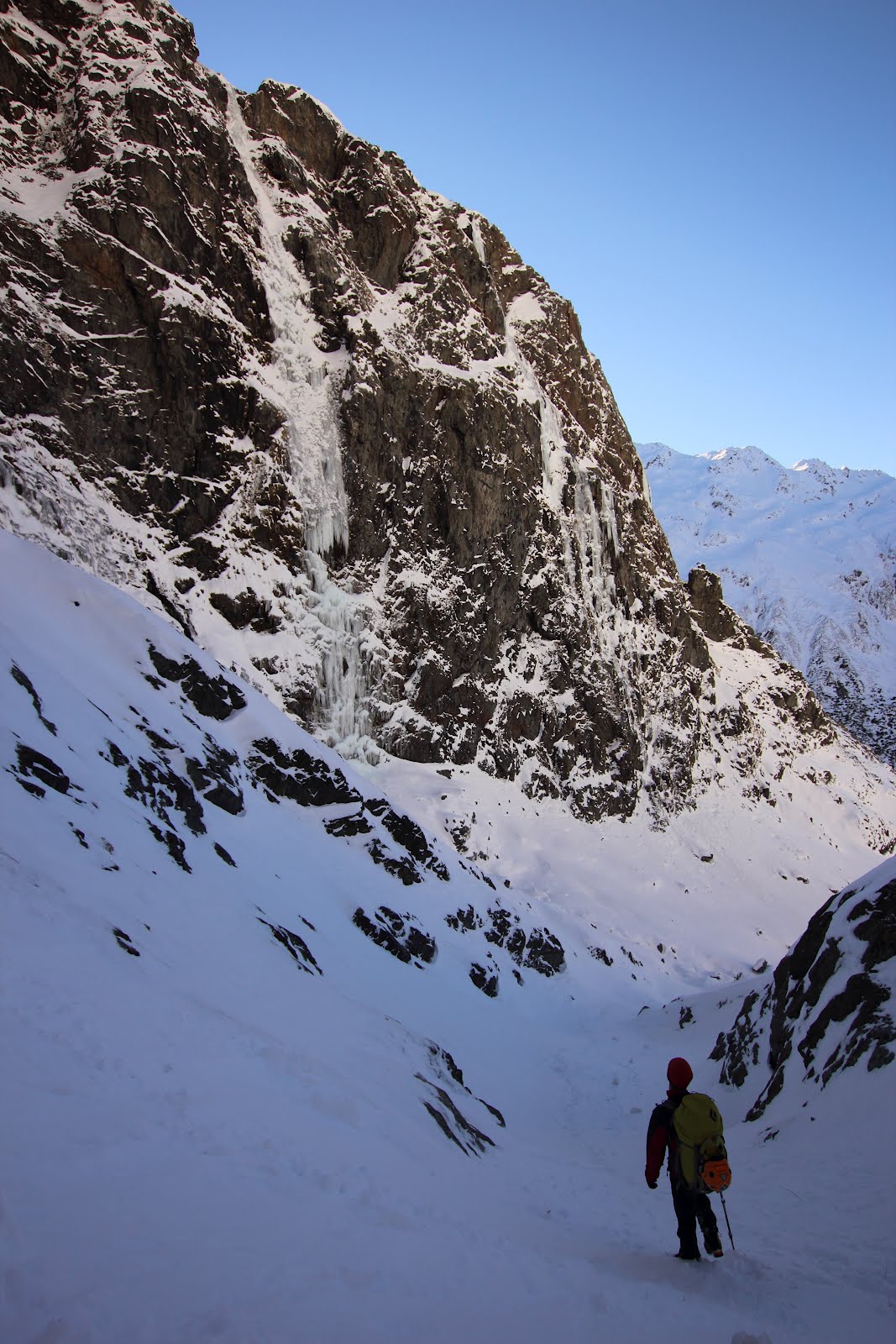 The unstable-looking daggers overhead, along with a warming temperature, convinced us that it was not going to be our weekend. We retraced our steps down valley, through the snow, in search of coffee.