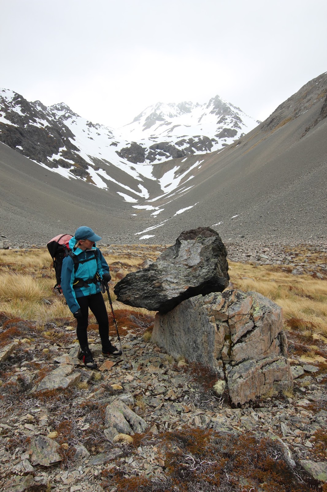 Low cloud and a strong westerly chased Shelley and I over the pass, leading down to a branch of the Watson Stream catchment. A falcon flew by at speed, similarly buffeted by the wind. There was still plenty of snow about, and we followed various tongues into the Watson, making for much nicer travel than the steep scree slopes. Certainly by late summer and autumn, this pass should be free of snow.